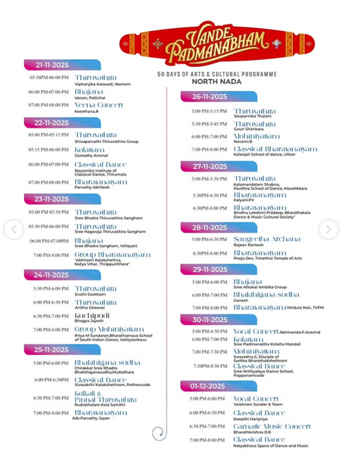 💃🎭 For 56 days , daily cultural programs are held—dance, music, and theater performances ( Bharatanatyam, Mohiniyattam, Carnatic music, Thiruvathira , etc.)—on stages located along the temple (fort) gates. Performances begin at 5:00 PM, with morning performances on some days.